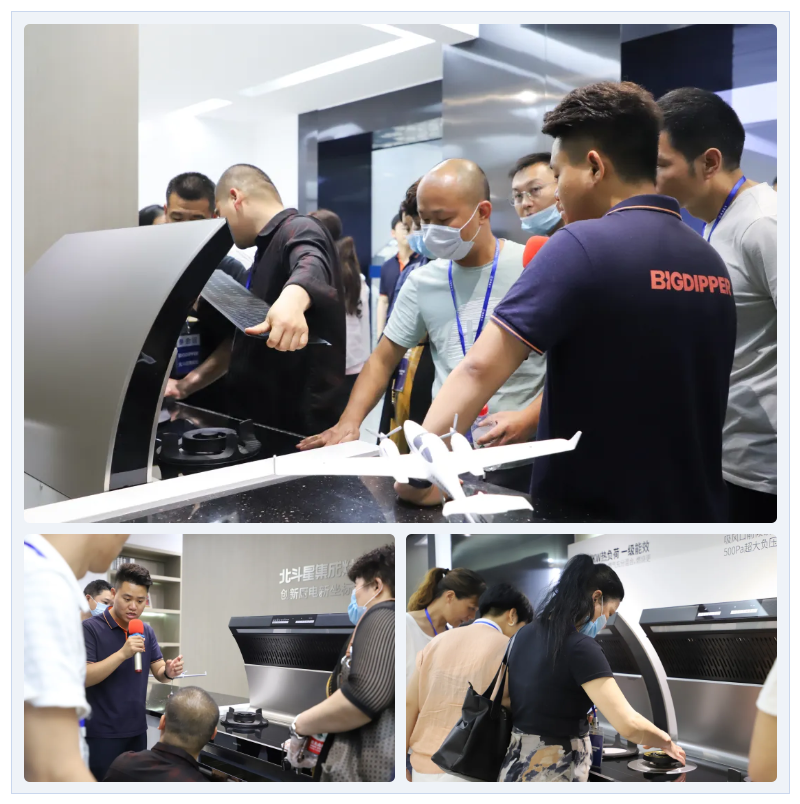 展廳現(xiàn)場,工作人員為大家展示了北斗星家族產品標志性的創(chuàng)新特性——“天一無縫,就是好擦”的一體式無縫臺面,擦洗無死角,就是好清理!更有“爆炒辣椒無嗆味”,讓在場的所有人士為之贊嘆不已,北斗星集成灶吸煙功能真棒!
