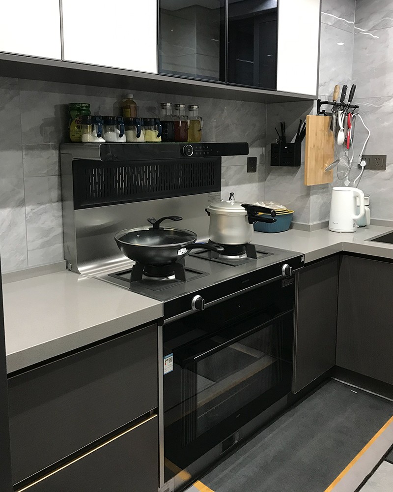 陳女士的廚房是由專業設計師一手操辦的,出于最大限度的滿足廚房空間使用率,在設計過程中,選擇了北斗星”大師級 真蒸烤“A5集成灶,集成油煙機,燃氣灶,蒸烤箱于一體。不僅節省了一米櫥柜臺面、一米地柜的費用,還最大限度利用了廚房中有限的空間,可充分利用頂部空間加裝一排櫥柜。