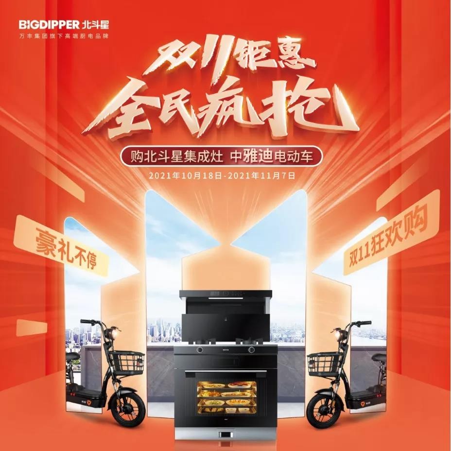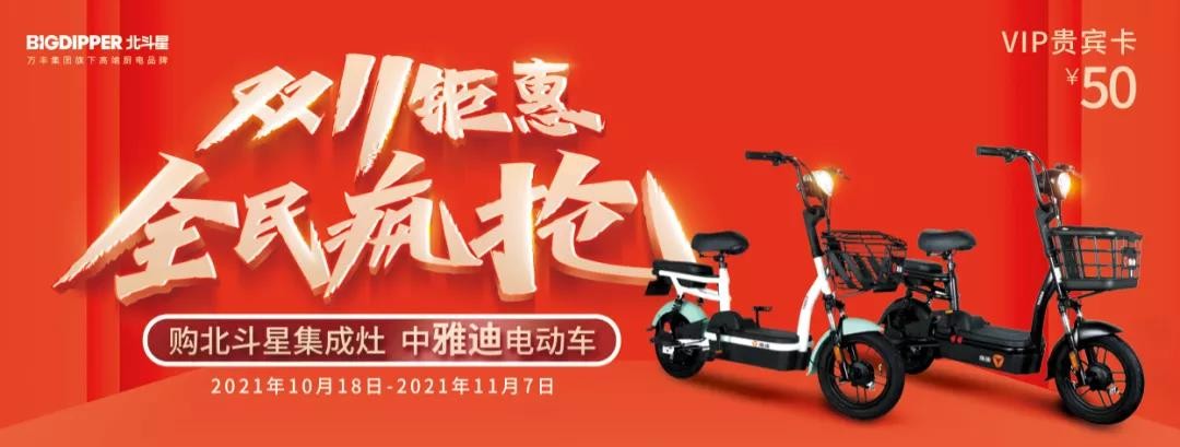 活動期間,顧客憑“全民瘋搶”VIP貴賓卡消費,實交金額滿5000元以上,即可參加公司總部直播抽獎,“購北斗星集成灶,中雅迪電動車”活動,豪華雅迪等你開回家!(全國獎品100臺,針對終端消費客戶)