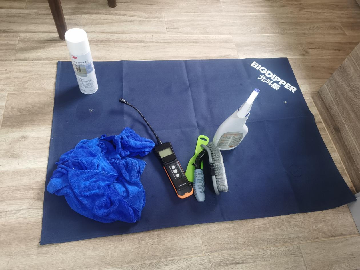 圖一:服務(wù)小哥所帶的部分清理工具。他們進(jìn)門的時(shí)候會(huì)自帶腳套、手套,會(huì)問一下你集成灶的使用感,有沒有什么問題需要解決。我這使用一年的集成灶并沒有什么問題,他們就開始給我進(jìn)行一個(gè)正常的保養(yǎng)工作——清潔。