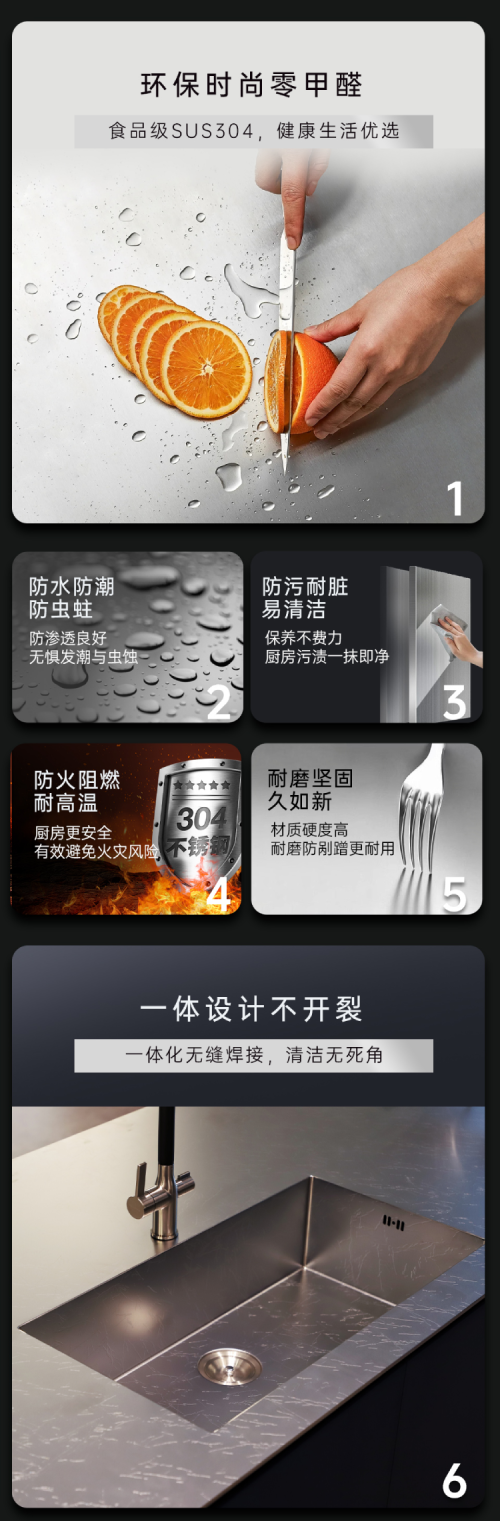 甄選304食品級(jí)不銹鋼作為產(chǎn)品基材,不含甲醛、苯等污染源,無(wú)懼與食物直接接觸,將米其林三星廚房搬回家。
